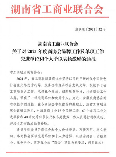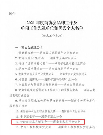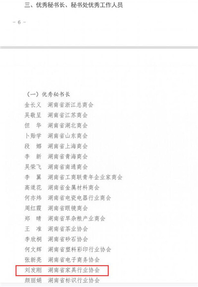 经省工商联主席会议研究通过,湖南省家具行业协会获评“2021年度商协会品牌工作先进单位”,我会执行会长兼秘书长刘发刚获“优秀秘书长”荣誉称号。