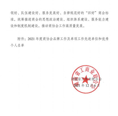 此次我会获评“2021年度商协会品牌工作先进单位”,是继获评全国工商联2019-2020年度全国“四好”商会后的又一殊荣,这既是全国工商联及省工商联对我会会务工作的肯定,也是对我会日后工作的一种鞭策,我会定当再接再厉,争取再创佳绩!