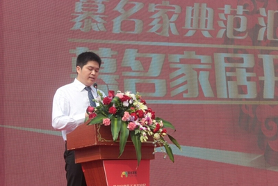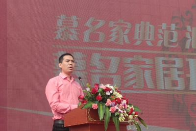 慕名家居广场总经理陈峰先生致辞对所有来宾表示热烈的欢迎及感谢,广东省湖南商会家具协会会长、安曼家具董事长刘名湖先生对慕名开业表示祝贺,随后厂商代表-华胜集团总经理曾广智先生代表入驻厂家发言。