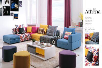 蝶依斓2014年家具展新款布艺沙发在沙发的造型设计上,追求多变、个性化、层次感,采用圆润饱满、比例协调,弧形的线条与款式相结合,彰显青春、时尚气息,至善至美,用多色混搭风格演绎着青春的蓬勃与生机。