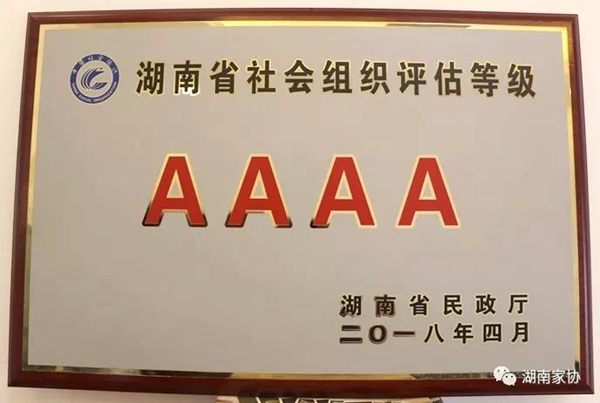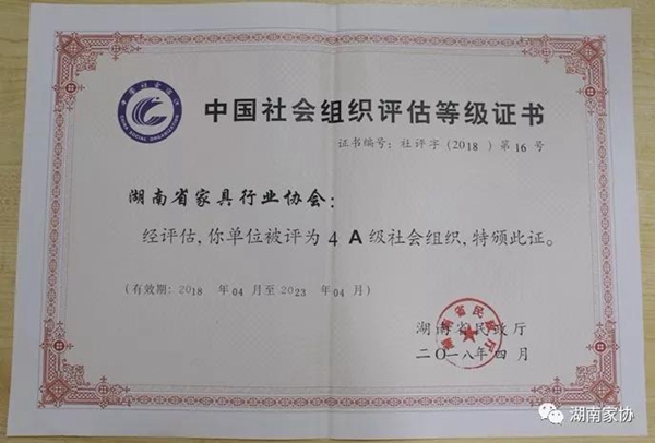 2018年4月,在湖南省社会组织评估等级评定中,湖南省家具行业协会经湖南省民政厅评定,被评为“AAAA”级协会。